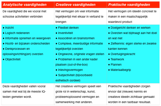 Sternberg onderscheidt drie denkvaardigheden: de analytische, creatieve en praktische intelligentie.